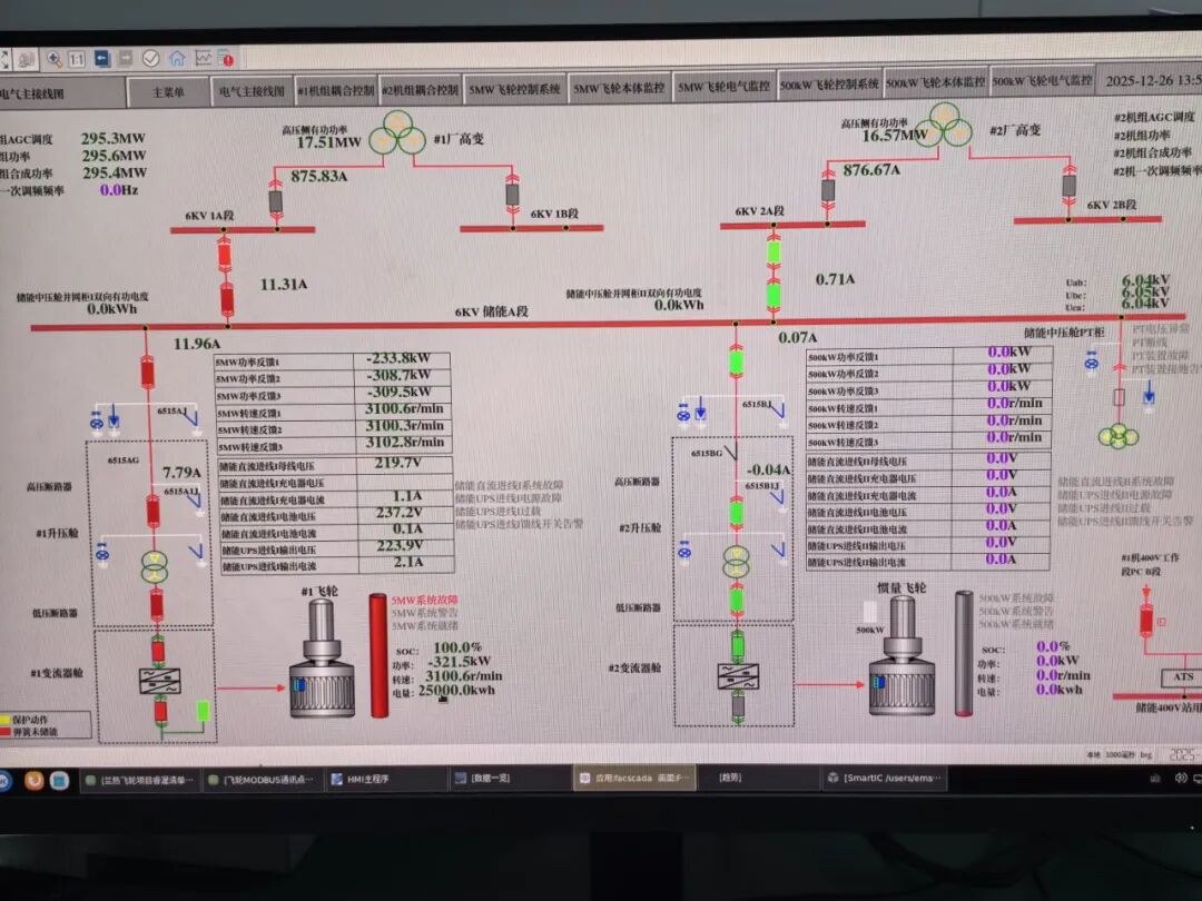 调试期间,成功完成了5MW飞轮多负荷场景充放电测试,涵盖大充大放等典型工况,并对PCS变流器功率保护定值进行优化。同时,完成了睿渥DCS与飞轮主控PLC的“三遥”点位核对、逻辑组态优化及远动RTU功率合成测试,确保了控制系统可靠联动。