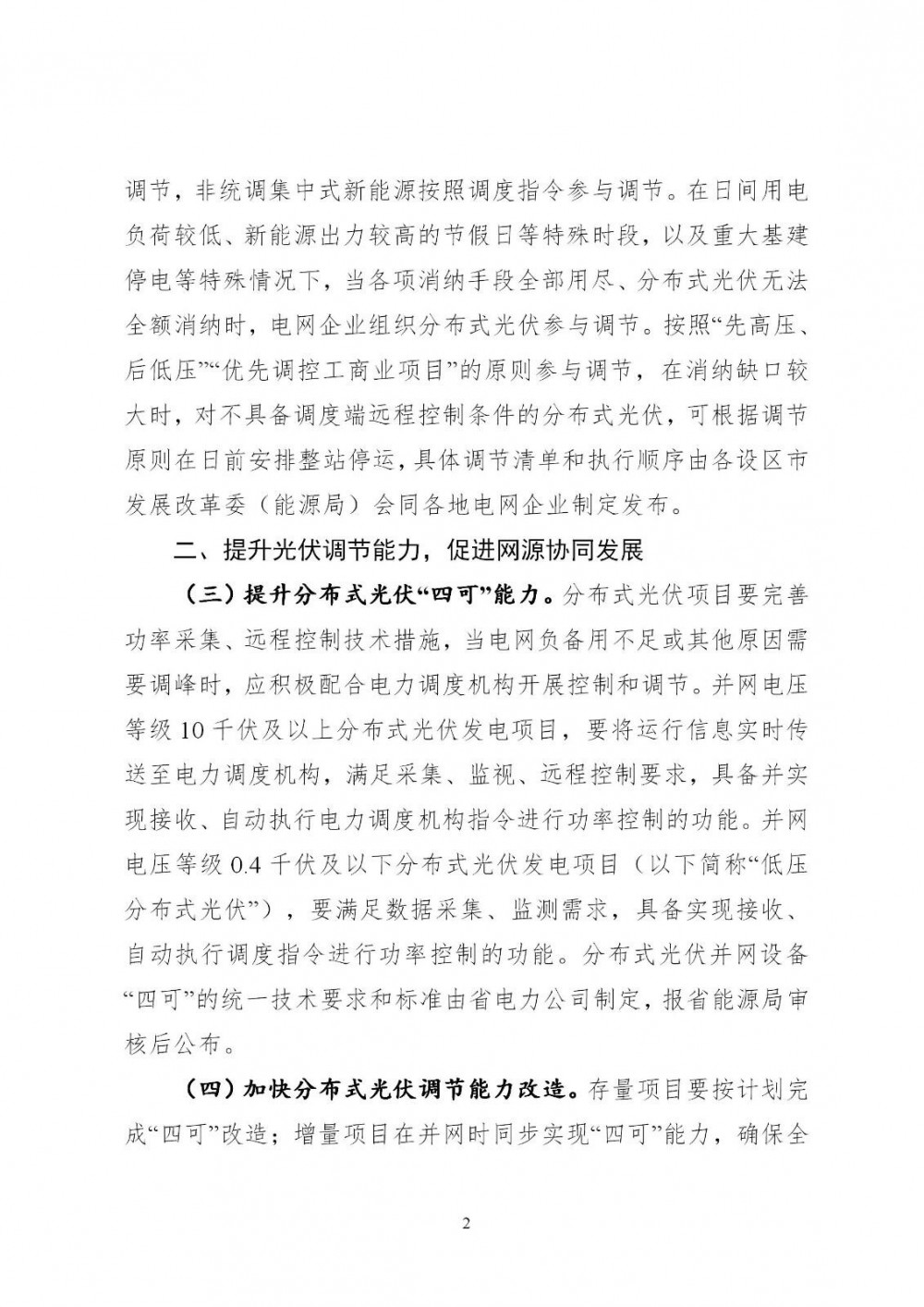 提升分布式光伏“四可”能力。分布式光伏项目要完善功率采集、远程控制技术措施,当电网负备用不足或其他原因需要调峰时,应积极配合电力调度机构开展控制和调节。并网电压等级10千伏及以上分布式光伏发电项目,要将运行信息实时传送至电力调度机构,满足采集、监视、远程控制要求,具备并实现接收、自动执行电力调度机构指令进行功率控制的功能。并网电压等级0.4千伏及以下分布式光伏发电项目(以下简称“低压分布式光伏”),要满足数据采集、监测需求,具备实现接收、自动执行调度指令进行功率控制的功能。
