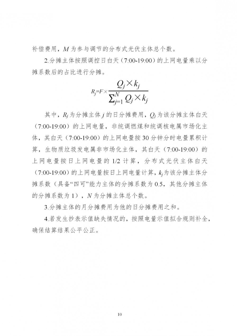 明确分摊范围和机制。补偿资金由非统调燃煤、统调核电、生物质垃圾发电和分布式光伏发电主体(除自然人户用项目外)进行分摊。非统调燃煤、统调核电和生物质垃圾发电的最小调节基准值参照统调燃煤的最小技术出力标准设置为40%,在分布式光伏参与调节的时段内,非统调燃煤、统调核电和生物质垃圾发电实际最小出力超过最小调节基准值的,需参与分摊,分摊系数为1,鼓励项目通过建设电源侧储能提升调节能力。分布式光伏发电在调节时段的上网电量全额参与分摊,具备“四可”能力的分摊系数设置为0.5,不具备“四可”能力的分摊系数为1。各主体根据调节日白天(7:00-19:00)上网电量乘以分摊系数后的占比进行分摊。按照全网调节和局部电网调节情况,公平合理分摊费用。